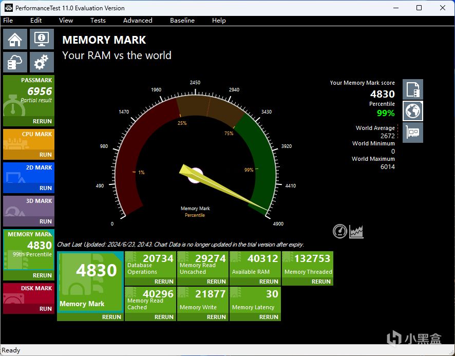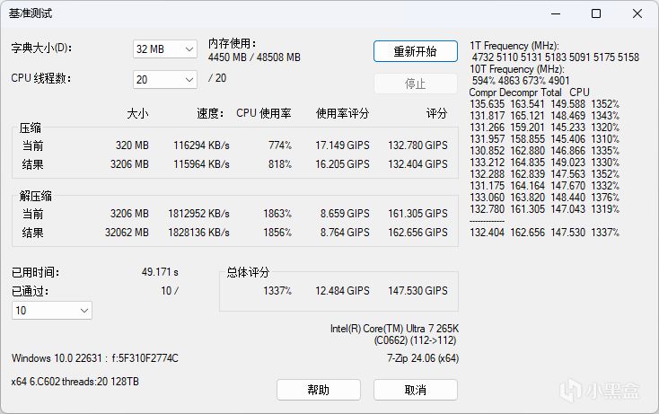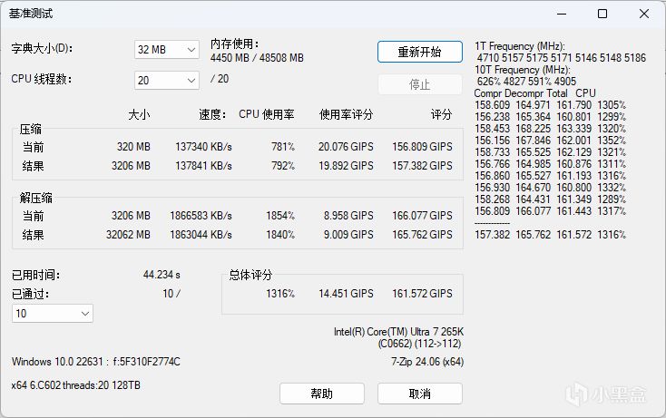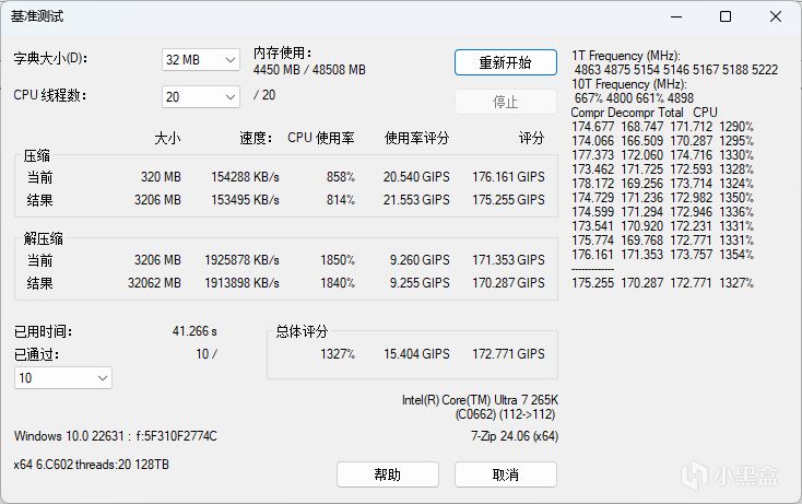 8600 MT/s(Memory Try It!):进入BIOS,通过Memory Try It!直接8600 MT/s,时序40-56-56-139 CR2下,电压1.5V,AIDA64 内存测试读取、写入、复制以及延时的性能数据分别为128.87 GB/s、124.10 GB/s、124.03 GB/s以及72.7ns。Performance Test内存性能测试得分4830,通过7ZIP基准测试。