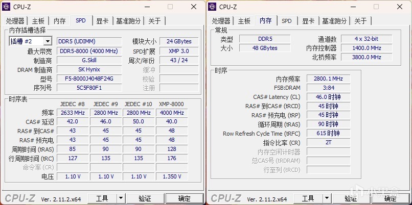 CPU-Z显示Trident Z5 Royal 皇家戟 DDR5 8000内存采用 SK Hynix M-Die原厂颗粒,默认频率为5600,开启XMP后即可直接享受 8000 CL40-48-48-128 的高频效能,INTEL平台下在JEDEC内存规范下提供了4套预设频率。