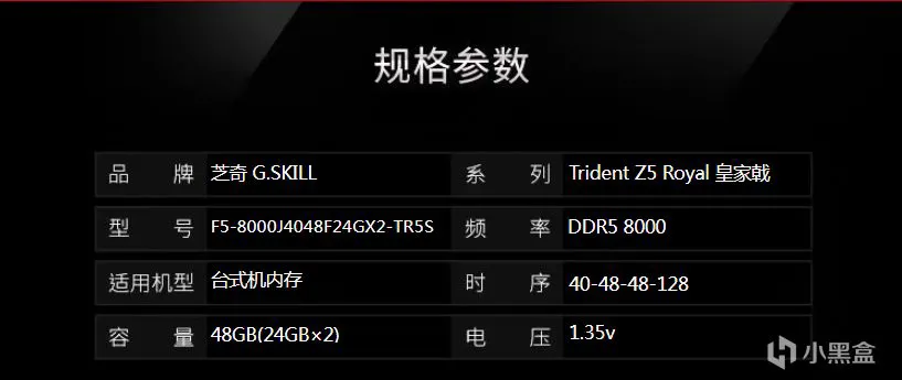 芝奇皇家戟DDR5系列推出了典金、银两种经典时尚配色,本次体验的为银色款,采用海力士新一代M-Die颗粒,支持 Intel XMP 3.0 内存超频技术,8000MHz频率,时序CL40-48-48-128 =,容量为24G*2,产品生命周期保固。
