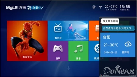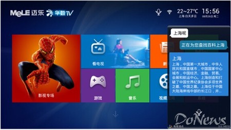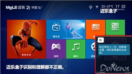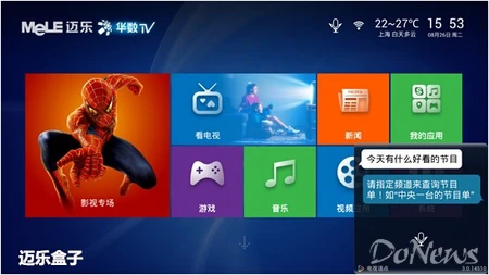 激活麦克风后,进入助手说话界面。从下图可以看到智我盒子助手界面风格扁平,突出内容。坐在客厅的沙发上,能很轻易的看清和使用。迈乐盒子的助手界面位于右下角,看起来很吃力。整个界面内容比较多,整体性不强。作为突出语音功能的盒子而言,用户显然更喜欢左图这种简单清晰的界面。