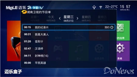 “芒果台明天有什么节目”都能准确理解,包括芒果台、昨天、今天等信息。迈乐盒子还支持电视节目单的预约功能,视图的显示内容更多。