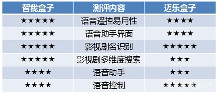 笔者总结上述六项评测内容,以满分为5分,大致打分如下图。总体来说,智我盒子和迈乐盒子的语音功能对用户而言都表现不错,但在影视剧名多维度搜索、上下文理解、助手功能上智我盒子表现更加出色。其实笔者今天做的两个智能盒子语音操控评测对比,PK背后的PK是语音技术提供商云知声对比科大讯飞。