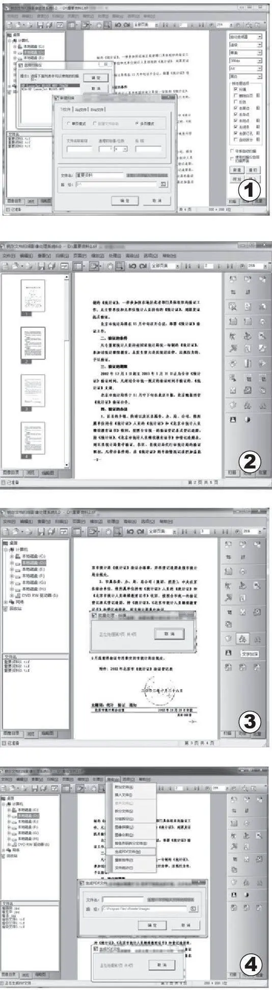 处理好一个TIF文件后,从“高级”菜单中选择“生成PDF文件”项,在弹出的“生成PDF文件”对话框中,设置好文件名和保存位置。点击“确定”,将TIF文件转换成PDF电子书格式文件(如图4)。