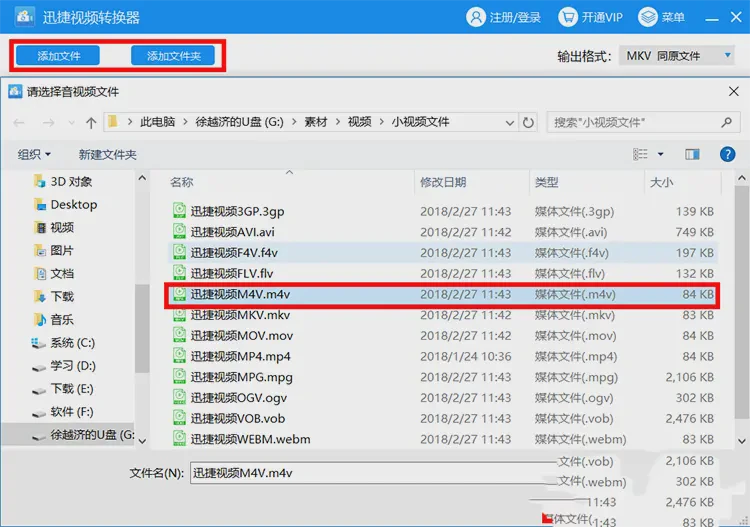 2、安装完成后,打开视频格式转换软件,点击添加文件或者点击添加文件夹,选择M4V格式的视频文件并且将其打开,