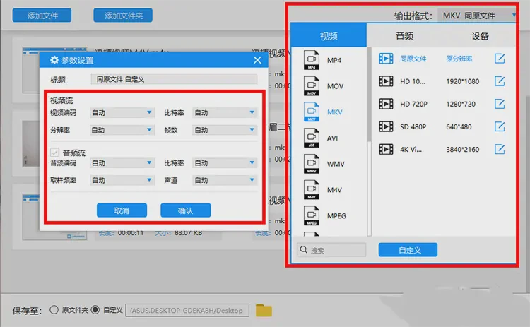 3、打开之后,点击右上角的输出格式中的视频,选择到MKV视频格式以及选择一个视频分辨率,后面的按钮可以自定义设置输出视频的参数,