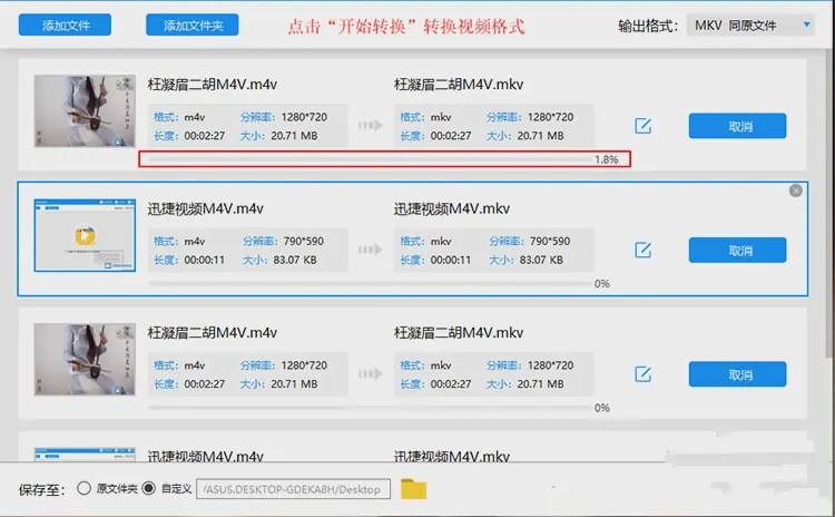 5、以上设置完成后,点击开始转换,然后只需等待进度条走到100%,视频格式就转换完成了,再在桌面上打开视频就能够观看了。