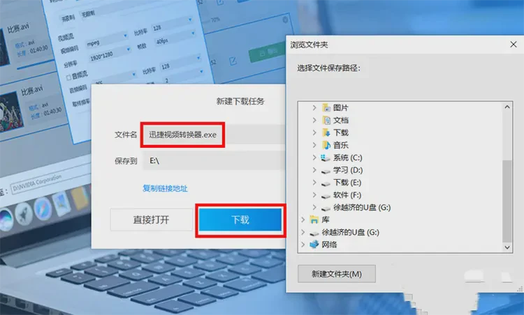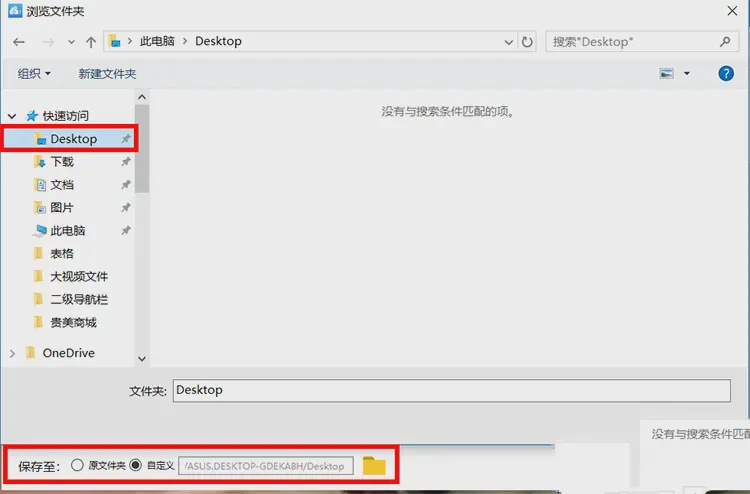 4、点击下方的自定义以及文件夹,在弹出的对话框中可以将输出视频的地址设置为桌面上,