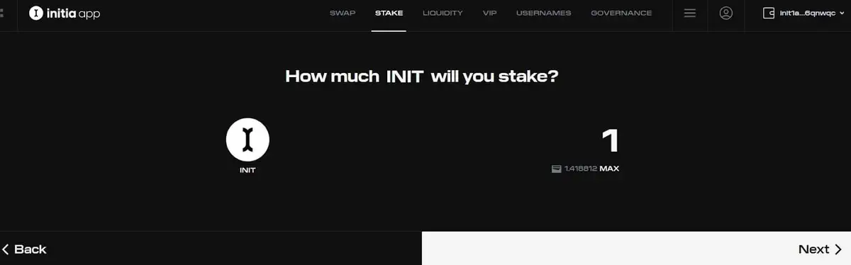 连接你的钱包并选择 INIT 代币进行质押后,该应用程序将询问“你将质押多少 INIT?”。输入金额或使用“MAX”按钮。确保留下少量 gas!然后按下下面的“Next”按钮。
