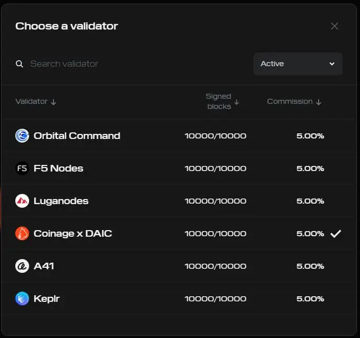 要做出客观的决定,请查看他们的佣金率和表现(已签名区块/正常运行时间)。DAIC Capital 在 Initia 上运行一个验证者(列为“Coinage x DAIC”),专注于为我们的委托者提供稳定的性能。