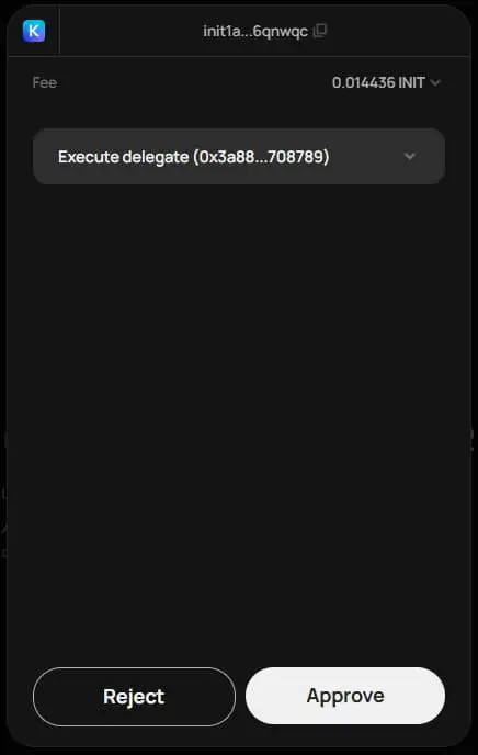 如果正确,请单击最终确认按钮 “Confirm”。然后,在你的钱包弹出窗口中 “Approve” “Execute delegate”交易,注意少量的 INIT gas 费。