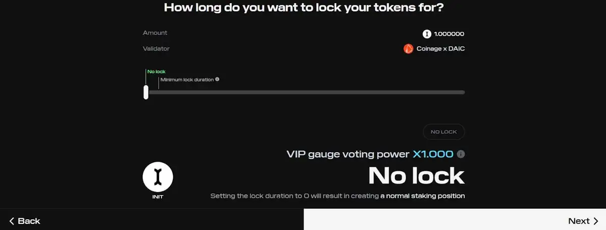 选择你的验证者并按下 “Next” 后,你将看到一个屏幕询问“你想锁定你的代币多长时间?” 锁定是可选的,你可以选择“No lock”。如果你选择一个持续时间(例如,30 天),它会通过一个乘数提高你的 VIP gauge 投票权。考虑这种提升与锁定你的代币更长时间之间的权衡。