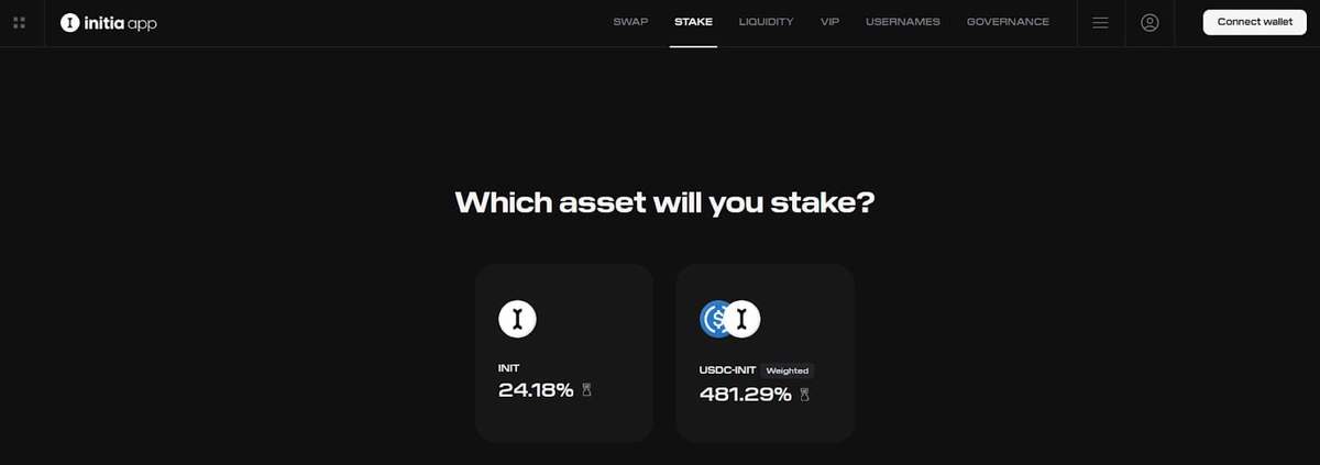 两种方式: 直接质押原生 INIT(可以选择锁定以获得 VIP 提升)或质押特定的 INIT 配对 LP 代币(Enshrined Liquidity)。