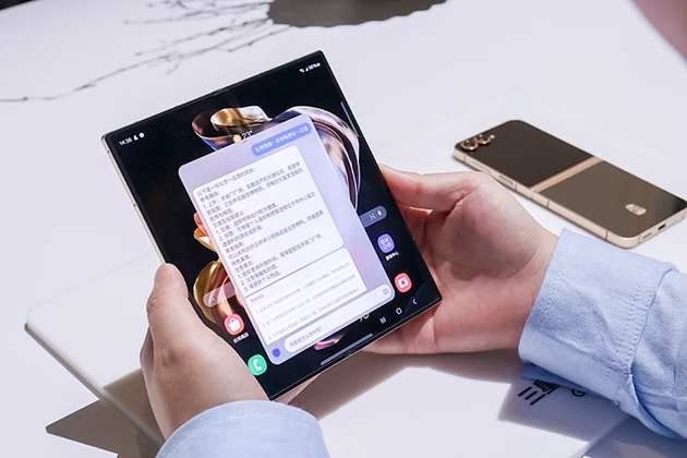 不仅如此,心系天下三星W25 | W25 Flip还搭载了一系列由Galaxy AI赋能的智能应用。同传翻译、通话实时翻译、即圈即搜、转录助手、笔记助手等功能,能够以强大的生产力,在工作当中成为用户的左膀右臂。心系天下三星W25 Flip还可借助聊天助手,让用户在合上屏幕时也能通过大视野智能外屏发送消息,并可根据上下文提供建议回复,只需从中选择合适的语句即可。