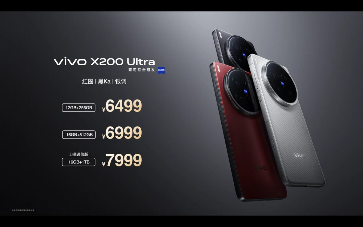 两款新品价格在此次发布会上公布,其中vivo X200 Ultra有12GB+256GB版本、16GB+512GB版本和16GB+1TB卫星通信版,售价分别为6499元、6999元和7999元,另外X200 Ultra 1TB 摄影师套装售价9699元。