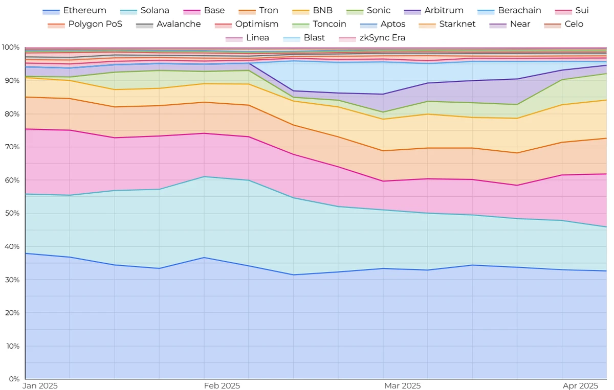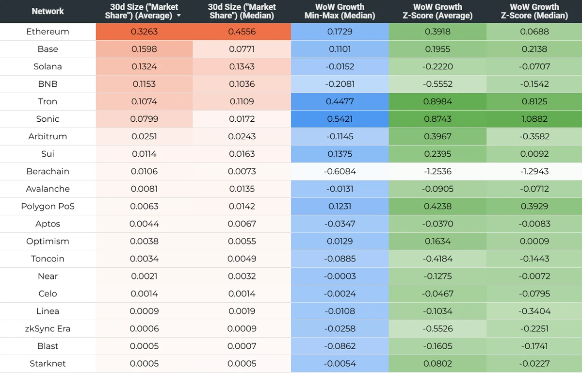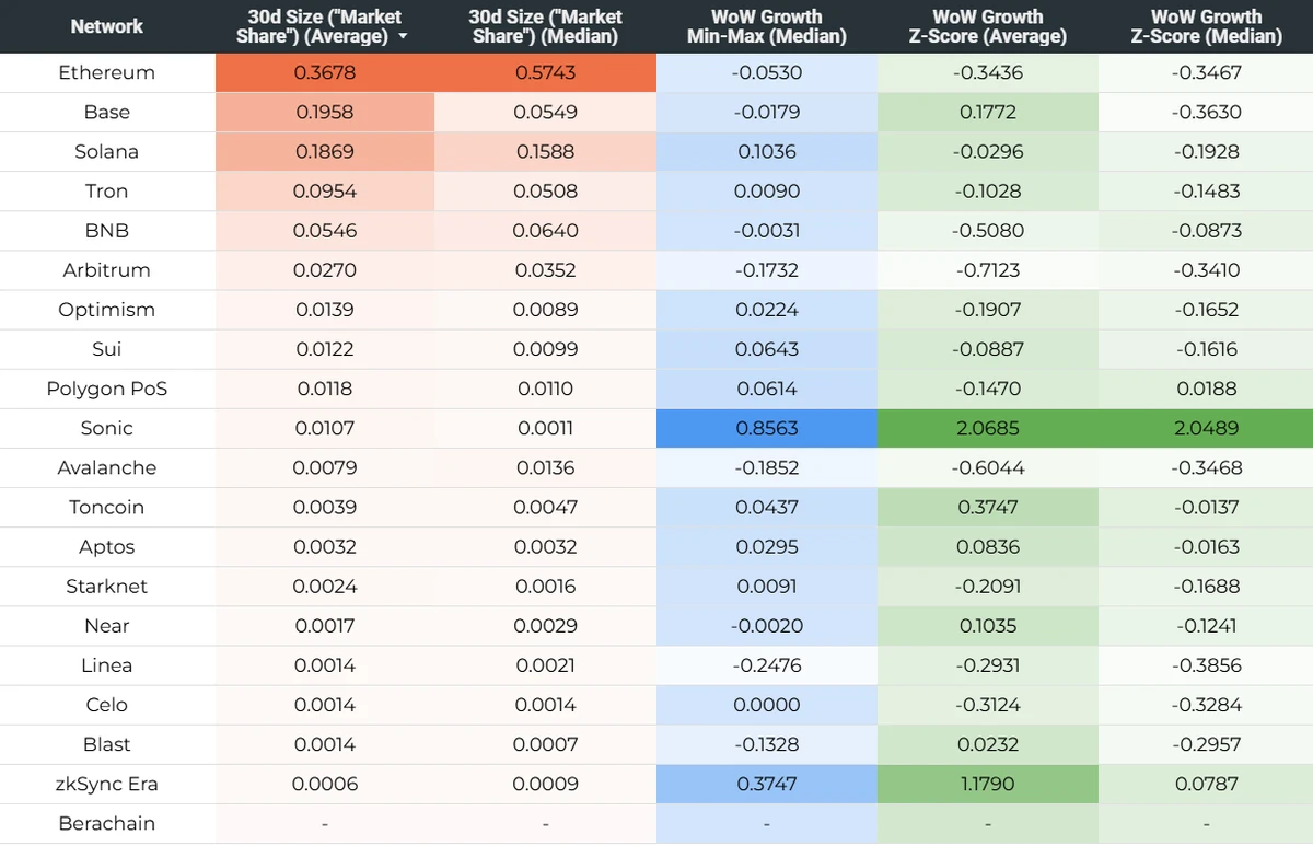 通过每周拍摄组合的30天规模分数的快照,可以跟踪每个网络在所有五个指标中的平均“市场份额”随时间的变化。下图1显示了自2025年初以来主要L1和L2的每周30天规模(平均值)分数。对于高级比较,组合平均值优于中位数,因为它对异常值更敏感(因此可以捕获网络在所有五个指标中的相对表现),而中位数主要是一个有用的补充,用于高亮显示此类异常值的影响特别强烈的情况。在2025年第一季度,前3名网络(以太坊、Solana、Base)的平均市场份额有所下降,这部分是由于该季度下半年市场活动整体下降(尤其是在Solana上),部分是由于像BNB这样的网络增加了其相对市场份额,部分是由于最近推出的Sonic和Berachain表现出了强劲的早期吸引力(即使后者在该季度末其指标显着下降)。