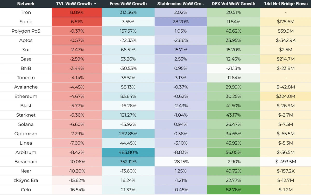 鉴于所有相关指标(TVL、费用、稳定币市值、DEX交易量、桥流动)在每日基础上都可能非常不稳定,因此在一段较长时间内比较它们是合理的,同时考虑到绝对值和增长率。时间段的长度应根据目标是评估长期趋势还是在较短的时间范围内比较网络来选择。在本例中,重点是后者。下表2显示了前四个指标的30天平均值和第五个指标的30天净流动;下表3显示了前四个指标的周环比(WoW)增长率(使用7天平均值)和第五个指标的14天净流动(参见脚注[1]关于不对后者使用WoW增长率的原因)。所有基础数据均为每日数据,截至2025-04-07,来源于Artemis或DeFiLlama(参见脚注[2]关于源数据的重要注意事项)。