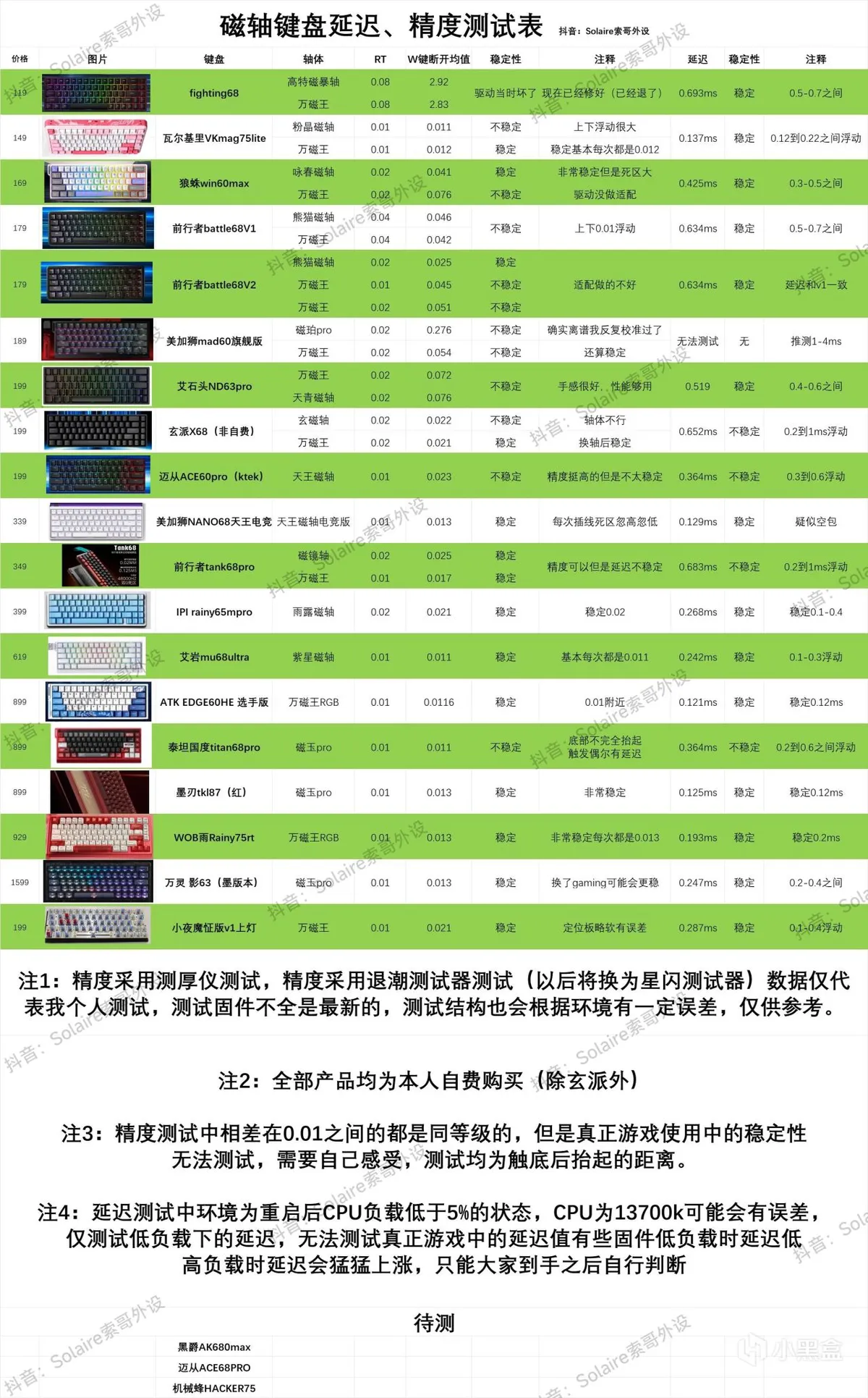 先省流,以下是测试出的数据,后续也会测试一些其他的键盘,全部自费购入,保证真实,希望盒友们给我点点关注,有一些视频上的改进建议也可以给我提。