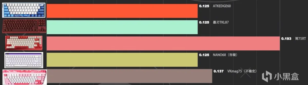 首先来到我们的延迟T0梯队,在延迟测试中,平均延迟在0.1-0.2之间的键盘有这些,延迟在低负载状态下真正稳定在0.1ms水平的键盘有ATKEDGE60,墨刃TKL87,雨75RT,和美加狮nano68,我个人认为除了美加狮nano68以外,其他键盘应该都是测试正确的,美加狮nano68疑似测试中发送空包数据来稳定0.125的测试数值,在这个档位,数值不稳定的还有瓦尔基里的VKmag75,使用的是容元的方案,低负载可以做到低延迟,但是跳动幅度很大