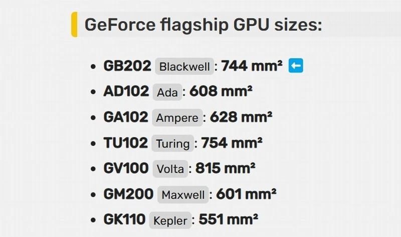 据MEGAsizeGPU最新爆料,RTX 5090的Blackwell GB202寸到了24x31毫米,即744平方毫米。相比现款RTX 4090的Ada AD102 GPU提升了22%之多,这也意味着其性能和成本的进一步提升。