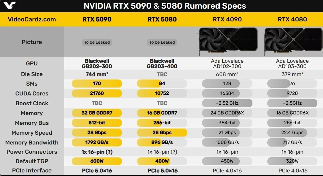 核心频率大幅提升,据悉为2900 MHz,比 RTX 4090提升了30%。